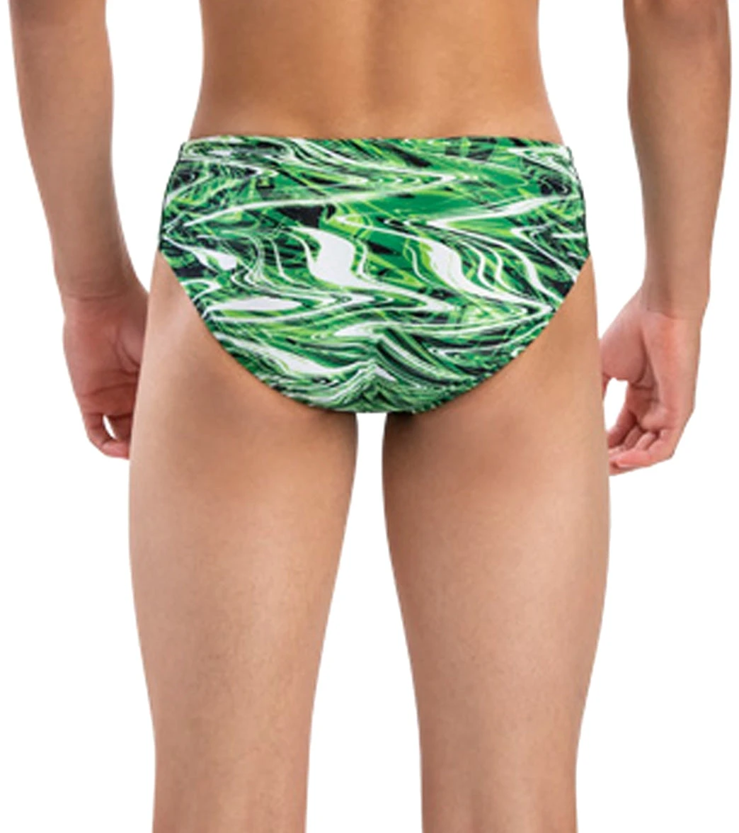 The Dolfin Men’s Reliance Jet Stream All-Over Print Racer Brief Swimsuit holds up through even the most intense practice schedules with its chlorine-proof construction and UV protection.