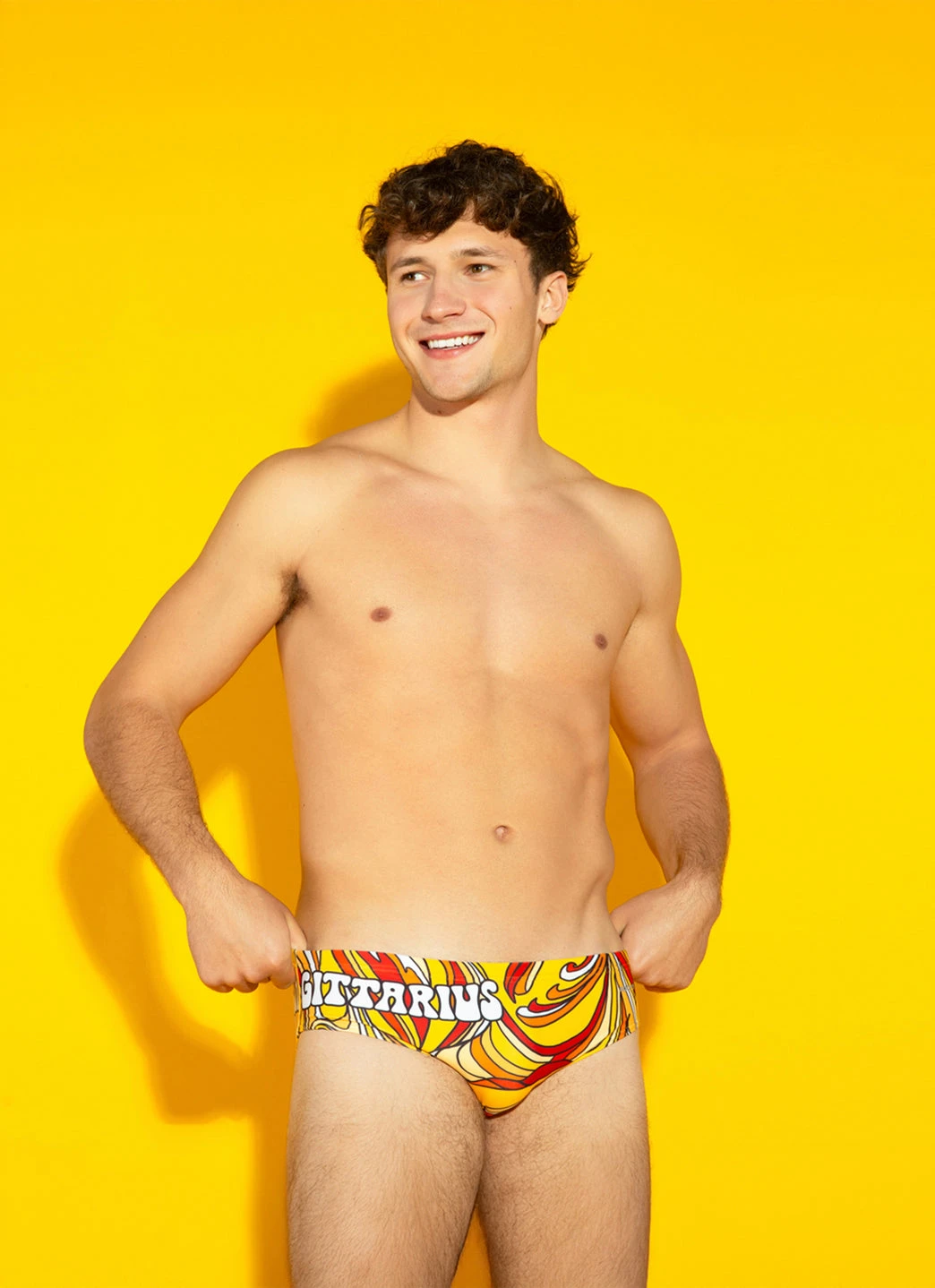 Embrace the power of the stars wearing the Sporti Groovy Zodiac Sagittarius Brief Swimsuit. This suit includes an adjustable drawstring waist, a comfortable front lining, and flat seams to reduce chafing. The brief style provides minimal coverage, effectively reducing tan lines and maximizing movement. Let your horoscope guide your strokes to be smooth and powerful throughout your laps.