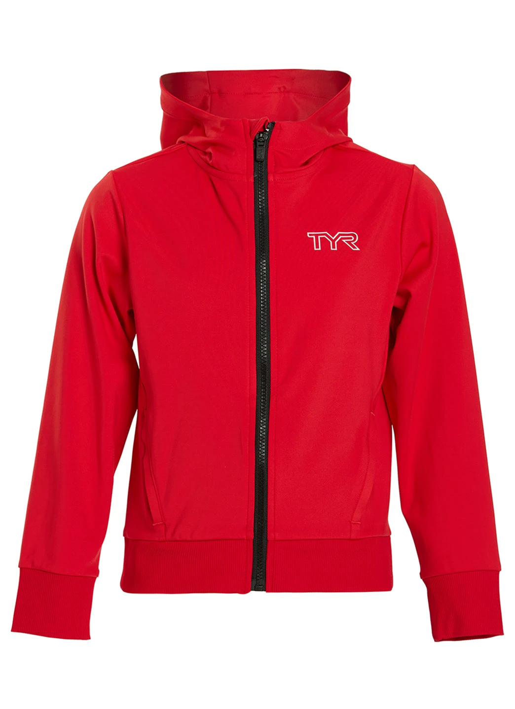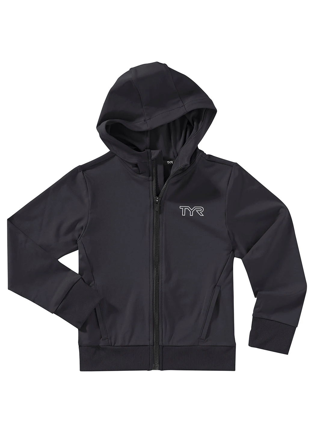 Give active kids freedom to move in the TYR Youth Tech Full Zip Hoodie, constructed from a stretchy spandex blend. Ribbed cuffs and hem, plus side pockets, provide secure warmth for any activity.
