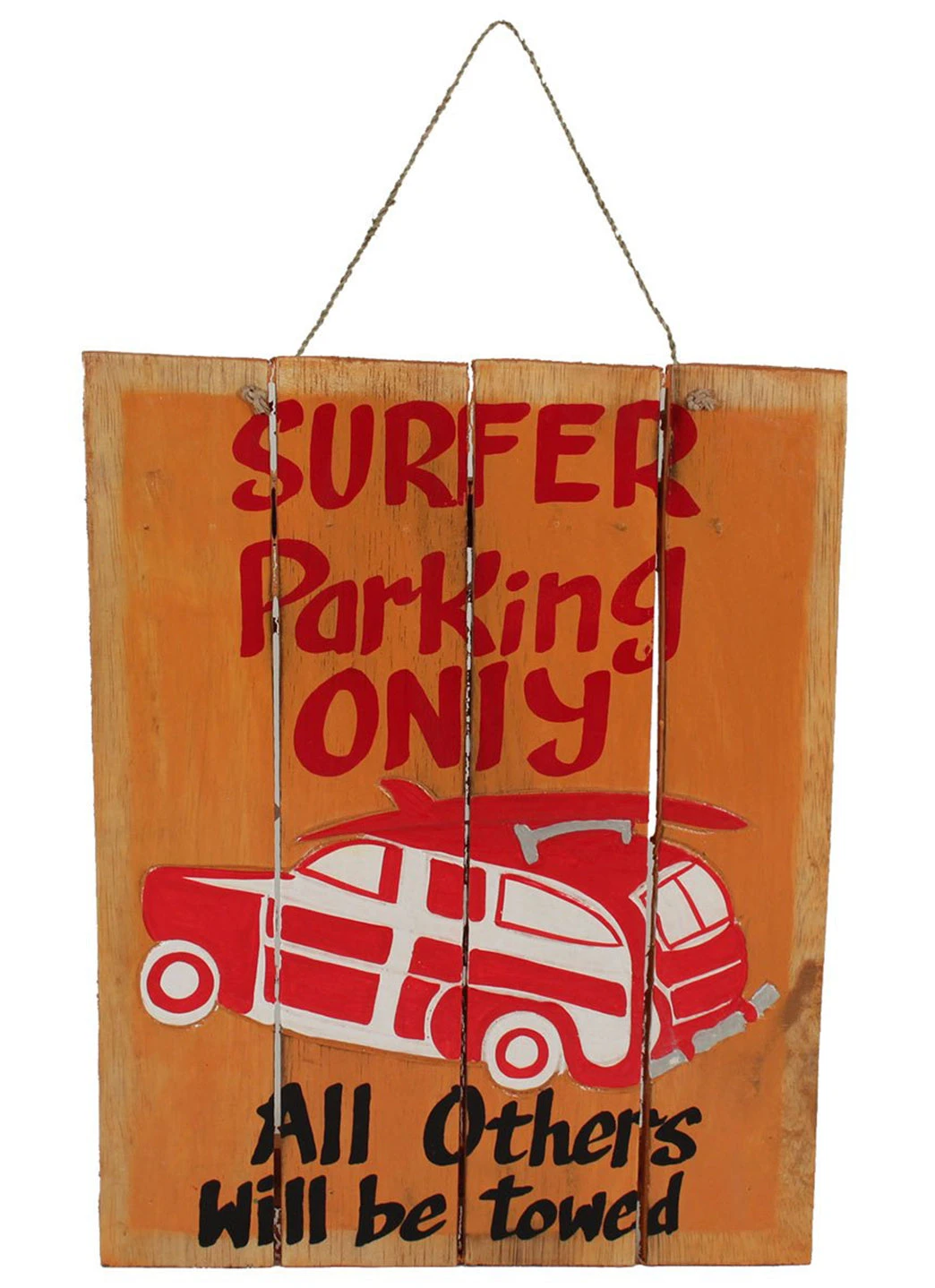 Make your home feel like you’re still on vacation with the Wet Products Surfer Parking Wood Slat Sign 12″x16″.
